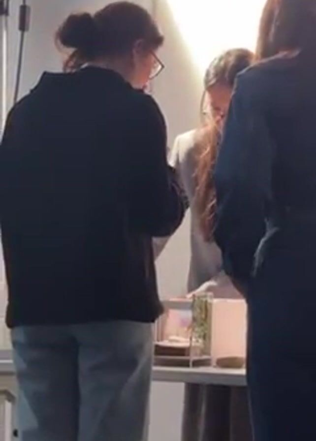 three individuals examining a small model on a table, illuminated by a bright overhead light. One person wears a black jacket and light-colored pants, another a light grey jacket, and the third a dark denim jacket. The camera then shifts focus to a man in a blue sweater standing next to the person in the black jacket. Subsequently, a projected image of a commercial kitchen space, potentially a cafe or restaurant counter, is displayed on a white screen.