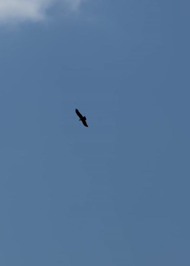 A bird of prey is flying in the sky. It circles at a great distance from the camera, set against a clear blue sky with the occasional white cloud.