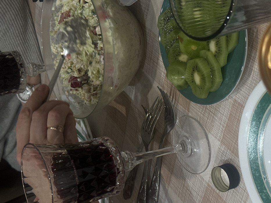A dining table is set with a salad bowl containing a mixed salad, a plate of sliced kiwi fruit, silverware, and plates. A hand wearing a gold ring holds a glass filled with a dark red liquid. Another glass of the same beverage is visible nearby. The table is covered with a striped tablecloth. The composition suggests a meal or gathering taking place.