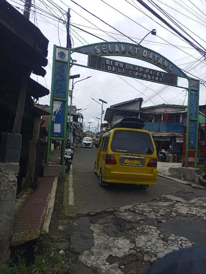The image depicts an urban street scene in Desa Cipendawa, RW 08, Kampung Pacet, which is an Indonesian location, not Meyong, India. A two-lane asphalt road, visibly cracked and repaired in the foreground, extends into the distance under an overcast sky. A green and blue metal archway spans the road, bearing the inscription "SELAMAT DATANG" (Welcome) and "DI RW 08 KP. PACET DESA CIPENDAWA". In the midground, a yellow passenger van with a black roof cargo box is positioned centrally on the road, facing away from the viewer. Its rear license plate, "F 1959 YP", is clearly visible. On the left side of the road, a narrow concrete sidewalk with a drainage channel borders a dark, weathered structure made of wood and corrugated metal. A white motorcycle is parked on this sidewalk near the left arch support. The street is lined on both sides by a dense arrangement of multi-story buildings, appearing to be a mix of commercial and residential structures, displaying varied colors, materials, and states of repair. Numerous utility poles support a complex network of overhead electrical and communication wires that crisscross the sky above the street. Several streetlights are also visible along the thoroughfare. Further down the road, a white car and another light-colored vehicle are discernible. The immediate foreground shows a dark, indistinct object partially obscuring the damaged road surface.