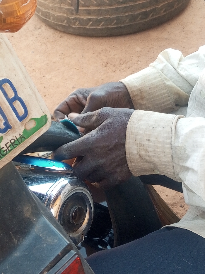 In Kakau, Nigeria, an individual's dark-skinned hands are depicted manipulating a small blue object. The hands, showing visible wrinkles, are positioned over a motorcycle's components, specifically a shiny chrome-plated cylindrical exhaust outlet and an adjacent blue-painted section. The individual wears a light-beige, vertically striped long-sleeved shirt with visible cuffs and dark trousers. A partially visible white Nigerian license plate, displaying "JB" and "NIGERIA" in blue lettering, is present in the foreground on the left. The background consists of exposed reddish-brown earth, with a large dark tire visible in the upper portion of the frame.