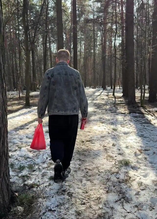 A man is walking away from the camera through a snowy forest. He is wearing a grey denim jacket, black pants, and sneakers. He is carrying a red plastic bag in one hand and a red can in the other. The forest is dense with tall trees and patches of snow on the ground. The sun is shining through the trees, casting shadows on the ground.