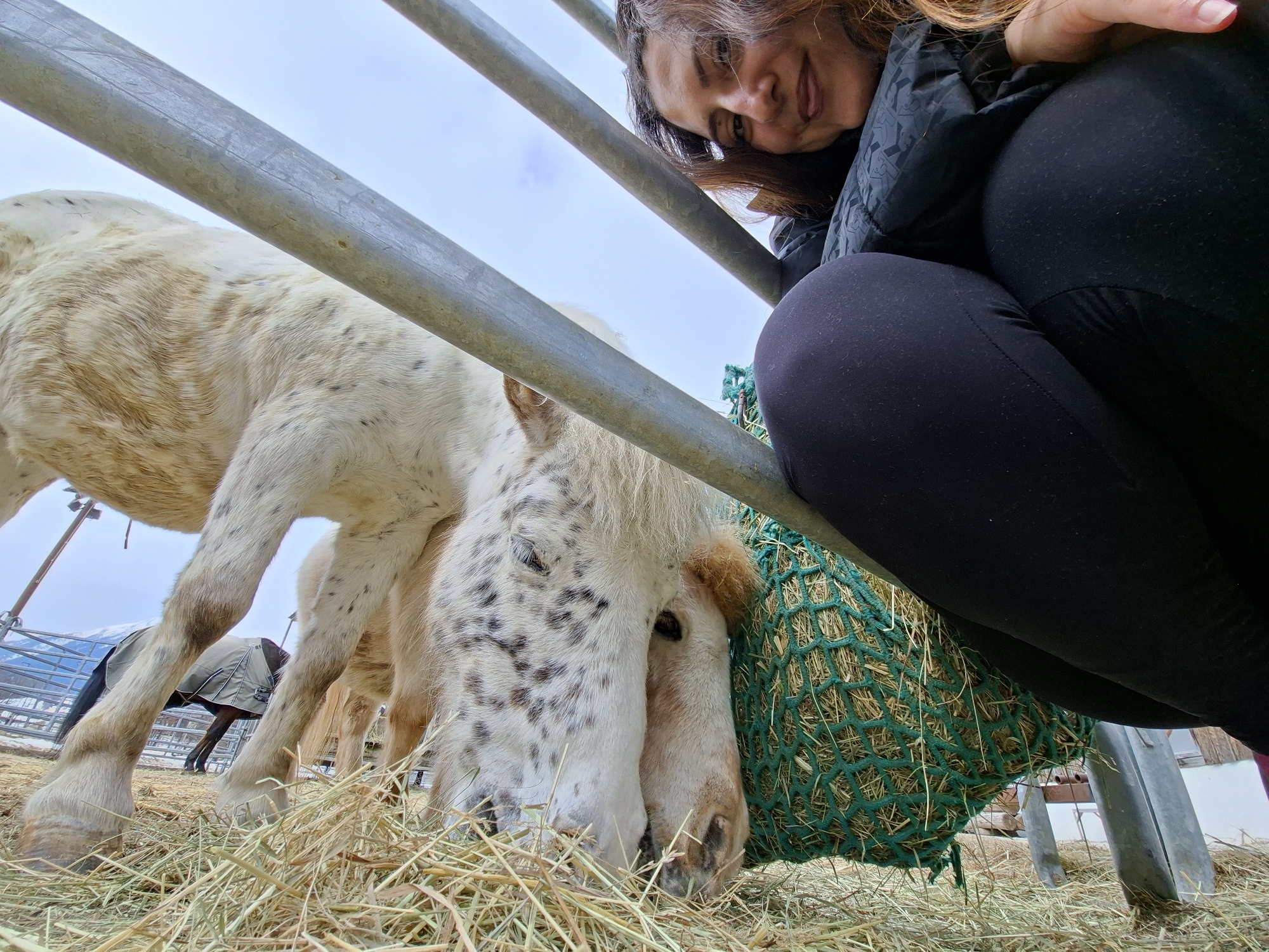The image depicts a low-angle view from inside a horse enclosure in Davos, Switzerland. A young adult female, positioned in the upper right quadrant, crouches behind two horizontal metal fence bars, looking towards the camera with a slight smile. She has brown hair and is wearing a dark, possibly padded jacket and black leggings. In the left and central portion of the foreground, a white and brown spotted horse is actively eating hay spread on the ground. Its head is down, engaging with the hay. Another horse, partially obscured by the fence bars, stands further back, wearing a light-colored blanket. Visible also is a green mesh hay net, partially filled, hanging near the crouching female. The ground is covered with scattered hay. In the background, beyond the enclosure, snow-dusted mountains rise under an overcast or light blue sky. The overall scene suggests an outdoor stable or paddock area during cold weather.