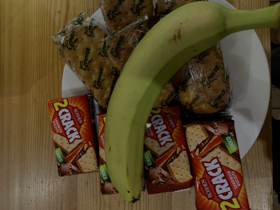The scene, located in Jrvej, Armenia, displays a close-up, overhead view of food items arranged on a white circular plate, which rests on a light-colored wooden surface exhibiting horizontal grain. A single, unpeeled banana, primarily light green with a few minor brown spots, lies diagonally across the plate, extending from the lower left to the upper right. To the left of the banana, three rectangular packets of "Roshen 2 CRACK Choco Sandwich Biscuits" are stacked, identifiable by their red and orange packaging. To the right of the banana, multiple round, flat crackers or biscuits, each individually sealed in clear plastic film imprinted with the repeating text "Grona," are visible on the plate. No individuals or active subjects are present in the image.