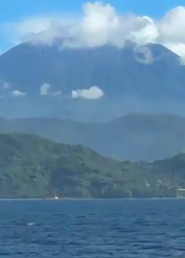 view from a moving boat on a sunny day. In the distance, a large mountain is visible, partially covered by clouds. The mountain is surrounded by smaller, green hills and a coastline with a few buildings visible. A large cargo ship is sailing on the water to the right of the frame, moving from left to right. The water is dark blue and choppy, with white foam forming at the front of the boat due to its movement. The sky is bright blue with scattered white clouds.