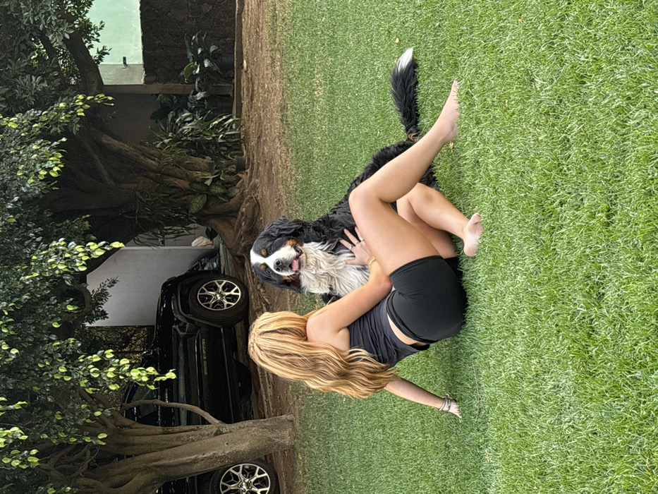 - "A young woman with long blonde hair and wearing a black top and shorts lies on her back on a lush green lawn, playfully interacting with a Bernese Mountain Dog" by FM-vhRXA3, licensed under CC BY 4.0