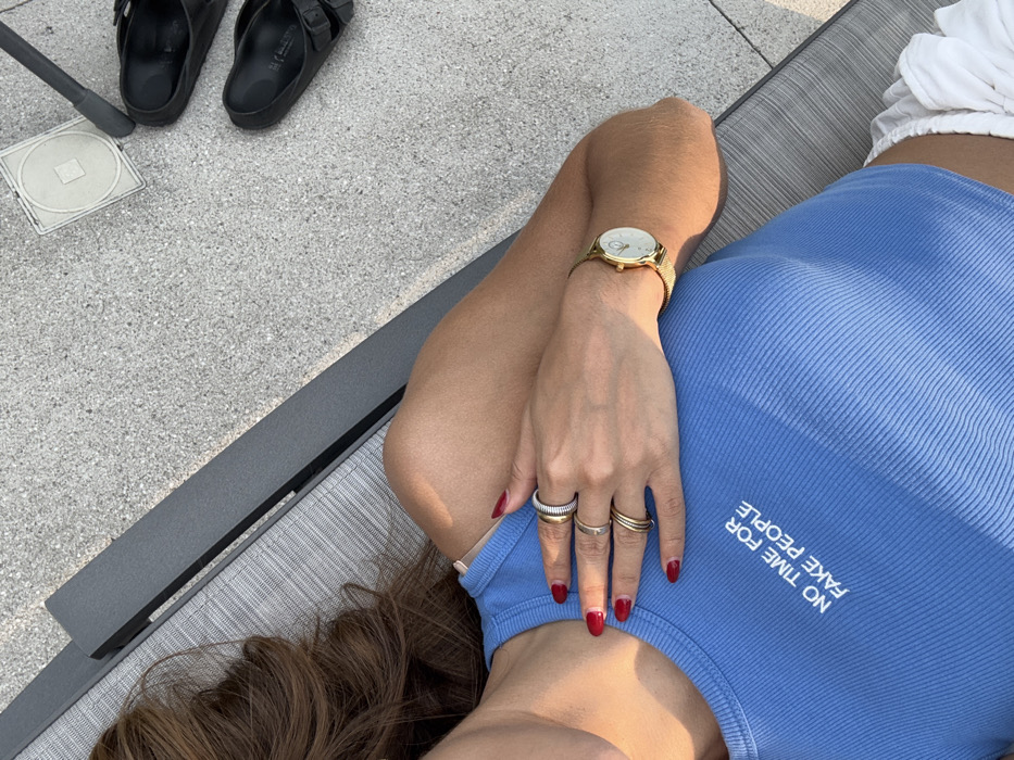 A woman lounges in the sun. She wears a light blue tank top that reads "NO TIME FOR FAKE PEOPLE." Her fingers, adorned with multiple rings and painted a deep red, rest on her torso. A gold watch is on her wrist. Nearby on the concrete are black sandals and a gray pole near a square drain. The woman has brunette hair. The scene appears to be outdoors on a sunny day.