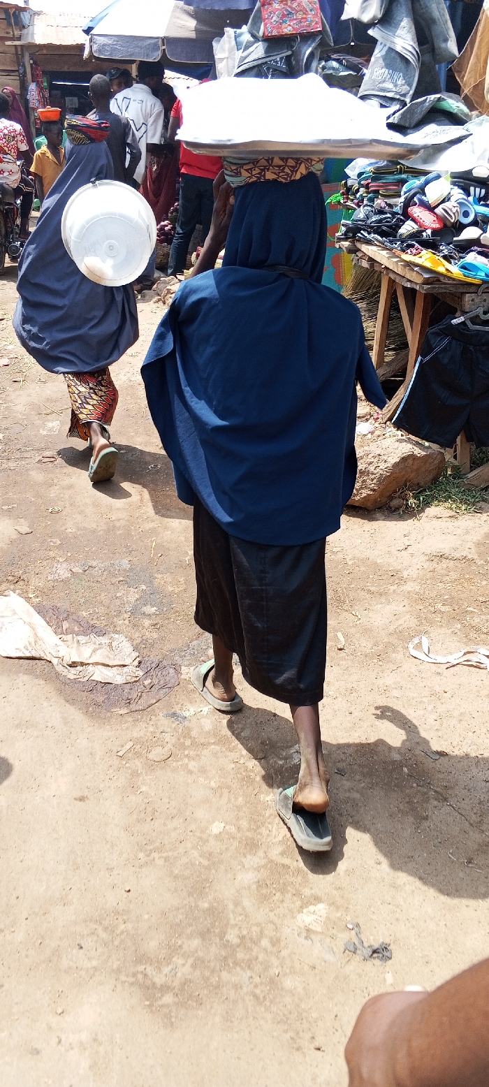 The image depicts a bustling outdoor market scene in Nassarawa, Nigeria, under bright daylight. In the foreground, viewed from behind, is an individual wearing a dark blue hooded garment over dark trousers, carrying a large, flat, light-colored tray or platter balanced on their head, secured by a patterned fabric wrap. This individual wears light-colored slide sandals, with their left heel partially elevated out of the sandal. Immediately ahead of them, another individual, also viewed from behind, wears a similar dark blue garment over a patterned, multi-colored wrapper skirt, carrying an inverted white plastic basin on their head. They are wearing light-colored sandals and walk in the same direction. The mid-ground and background reveal numerous individuals, primarily men and women, engaged in market activities. A wooden market stall on the right displays an assortment of footwear, including sandals and slippers. Various other goods, such as clothing and bags, are visible hanging from makeshift structures and under tarpaulin awnings providing shade. Piles of red spherical produce, possibly onions, are visible on a stall to the left-midground. The ground consists of uneven, packed dirt and sand, showing scattered debris and refuse, consistent with a busy outdoor marketplace. Shadows are cast by the people and structures, indicating a high sun position.