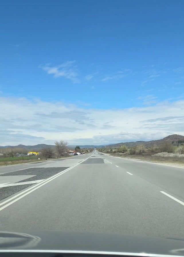first-person perspective of driving on a highway. The road is straight with noticeable repairs and is flanked by dry vegetation and low mountains in the distance. The sky is blue with scattered clouds. Other vehicles are visible on the road ahead. The dashboard of the car from which the video is recorded is visible at the bottom of the frame.