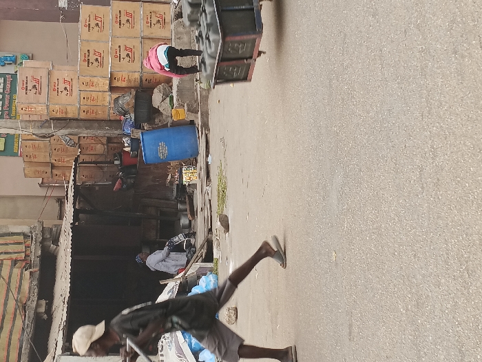 A street scene features a man pulling a cart down the road. Boxes are stacked high against a building, with a blue barrel and other items scattered nearby. Another person sits on a bench in front of a makeshift structure. The road is a light gray asphalt, and the overall atmosphere is one of a bustling, somewhat cluttered urban environment.