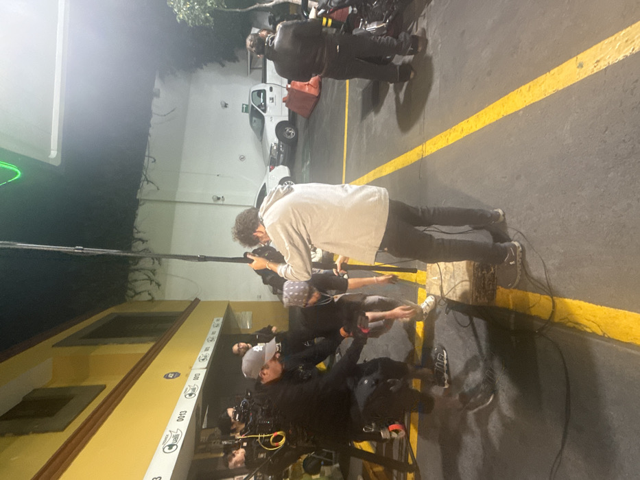 A film crew is on location, with people gathered around a camera. A man in a grey hoodie holds a boom microphone, while another person lies prone on the ground. A parked white truck is in the background. Yellow parking lines are visible on the ground. The scene is either set at dusk or night. A building with a yellow facade stands to the left, adorned with stickers.