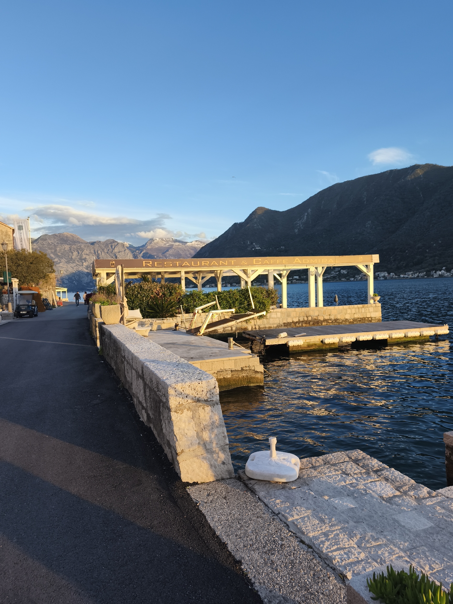 The photograph captures a waterfront scene in Perast, Montenegro, showcasing a restaurant and cafe along the shoreline. Foreground: A paved road runs alongside a low stone wall, leading to the water's edge. A white, round, object sits on the stone steps descending into the water. Midground: The restaurant and cafe "Restaurant & Caffe Admiral" is constructed over the water, supported by posts. Vegetation partially obscures the structure. A wooden dock extends from the restaurant into the water. Background: Mountain ranges are visible across the bay, with some peaks capped with snow. The sky is a clear blue, transitioning to a lighter hue near the horizon. In the distance, there are people walking on the road. A vehicle, possibly a golf cart, is parked on the side of the road. Environment: The water reflects the sunlight.
