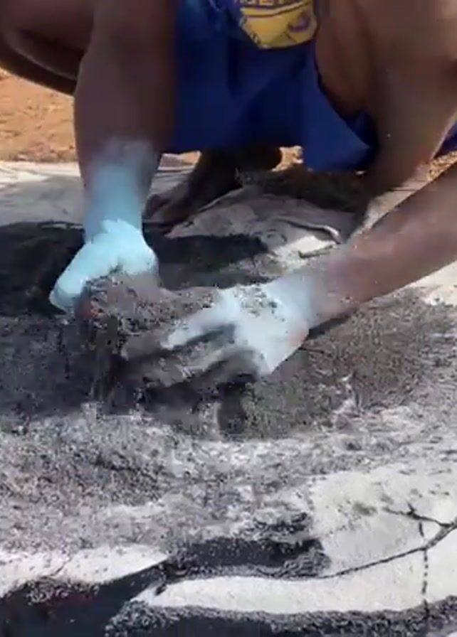 A person is shown from a low angle squatting in front of a pile of black and white granules. The person is wearing blue shorts with yellow lettering that reads "GOLDEN STATE" vertically on the right leg. Their hands are stained with a light blue color. The person is using their hands to mix the black and white granules together, creating a pile of gray material. The granules are spread out on a piece of fabric on the ground. The ground around the fabric is red dirt.