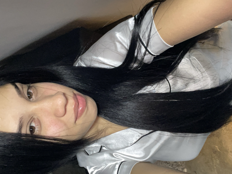A close-up indoor image features a young female subject. The specific location in Altagracia, Venezuela, is not discernible from the visual information presented. The subject has dark, straight, long hair cascading over her shoulders and chest. She possesses dark brown eyes and full lips with a slight sheen, looking directly at the camera with a neutral expression. She is wearing a short-sleeved, collared top made of white, satin-like fabric, featuring black piping along the collar and possibly the placket. The background is uniformly dark and indistinct, suggesting a low-light indoor environment without identifiable specific features. The image appears to be a selfie, with part of the subject's right arm visible on the lower right, extending towards the camera.