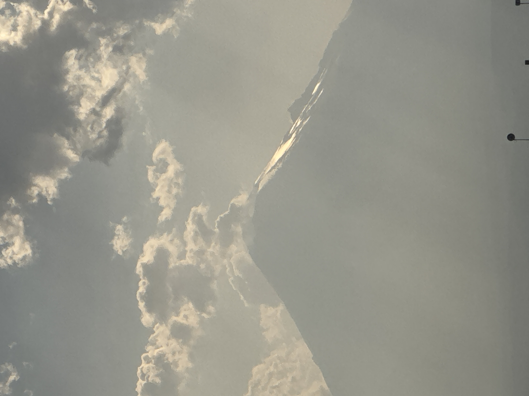 The image displays a distant, hazy view of a prominent, conical mountain, likely a volcano, observed from San Francisco Ocotlán, Mexico. The mountain occupies the central and lower-mid portion of the frame, its lower slopes heavily obscured by atmospheric haze. A distinct, elongated bright reflection, consistent with sunlight on snow, ice, or a reflective surface, is visible along the upper right slope of the mountain. The peak of the mountain is partially enshrouded by clouds or a subtle plume. The sky above is a light gray-blue, populated by scattered cumulus clouds, some illuminated brightly, others appearing darker. The extreme bottom edge of the image features a dark, indistinct horizontal band, presumed to be distant ground level or structures, with two thin, dark vertical poles, possibly streetlights, faintly visible in the foreground. No individuals or discernible actions are present. The lighting suggests either early morning or late afternoon conditions.