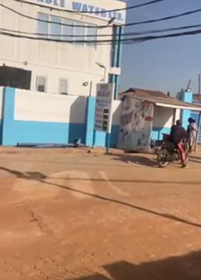 scene in front of a building labeled "D.F.F TABLE WATER LTD." The building is white with a blue stripe. A motorcycle rider in a black jacket and pink pants is near the entrance where three people are standing, two in suits. A small structure with a sign sits between the motorcycle and the building. The road is dirt or gravel. Utility wires are visible overhead.