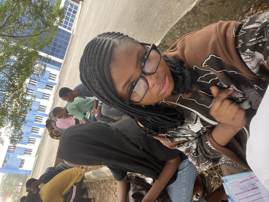 The image depicts an outdoor gathering of young adults in the city of Osu, Nigeria. In the foreground, a young Black female with black braided hair and black-framed glasses wears a brown zip-up hoodie with light-colored graphic designs. She is positioned for a selfie, looking directly at the camera, with her right hand pointing downwards towards a document partially visible on her lap, identified as a "DEPOSIT SLIP" from "OODUWA UNIVERSITY." To her immediate left, another young female is seated, viewed from behind, wearing a black hijab and light blue jeans, with a brown patterned bag next to her. In the midground and background, approximately five to seven other young individuals, mostly males, are seated or standing on a paved surface behind a low concrete curb. They are casually dressed in various colored t-shirts and trousers, appearing to be congregating or waiting. One individual in a light green shirt holds a white paper. The background features a multi-story building with a blue and white paneled facade, partially obscured by green tree foliage, under an overcast daylight sky.