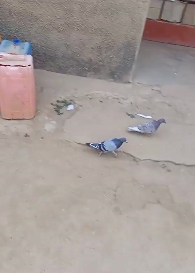 small group of pigeons near a building wall. Five plastic jerrycans of various colors (yellow, pink, blue) are stacked near the wall, beside a concrete patio. The pigeons are walking around the patio, foraging on the ground. The building's window is partially covered with a white cloth.