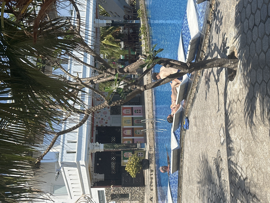 A poolside scene captures a sun-drenched day. Several individuals relax on lounge chairs beside a blue swimming pool. One person swims in the pool. Adjacent to the pool is a building with a painted facade reminiscent of colorful houses. A palm tree partially frames the view, casting shadows on the paved area surrounding the pool.