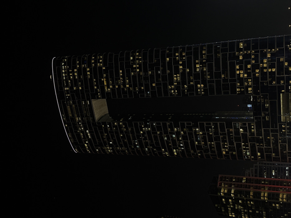 A contemporary building is shown at night. The structure features a unique design with multiple sections and a cutout center. Numerous windows are illuminated, creating a grid-like pattern. Another illuminated building is slightly visible in the background, seemingly reflecting the first building. The overall image has a dark, urban atmosphere.