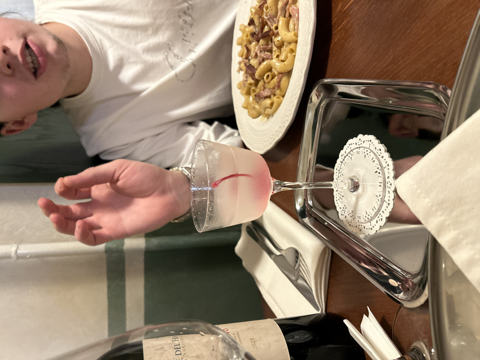 The scene takes place within an indoor dining establishment in Dnipro, Ukraine. The specific name or address of the establishment is not discernible from the visible elements. The environment features a wooden table surface and a light-colored wall with a horizontal green stripe in the background, under ambient lighting. In the foreground to mid-ground, a dark-colored wine bottle with "DEL FR..." and "2023" visible on its label stands next to the stem of an empty wine glass. A folded white linen napkin holds a knife and fork. A small, rectangular, reflective silver tray supports a stemmed cocktail glass containing a light pink liquid with a thin red garnish, likely a cherry stem, submerged. The cocktail glass rests on a white paper doily. To the right, a white textured plate holds a serving of macaroni pasta mixed with bacon pieces in a creamy sauce. A person, likely a young male, is partially visible from the mid-chest upwards on the right side of the image. They wear a white long-sleeved shirt with a light-colored design. Their right hand is raised with fingers curled in a gesture, and a watch is visible on their wrist. Their mouth is slightly open, suggesting an active conversation or reaction.