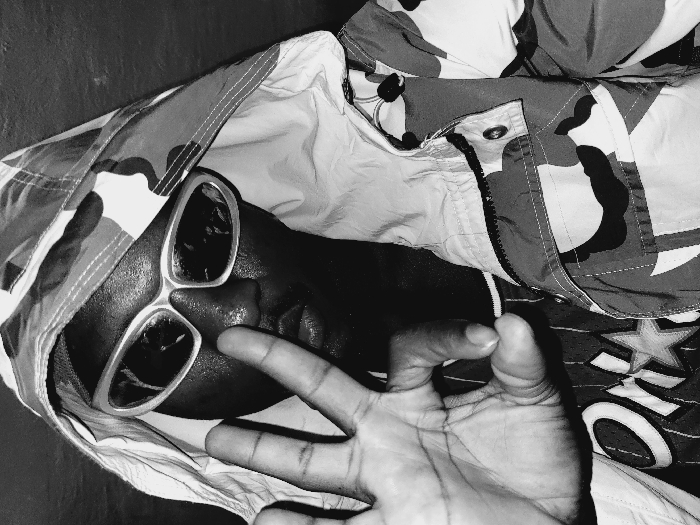A monochromatic, chest-up portrait depicts an individual with dark skin tone wearing a hooded jacket featuring a light and dark camouflage pattern. The hood is pulled up, partially obscuring the upper face, which is further covered by light-framed, reflective sunglasses. Beneath the jacket, a dark, mesh-textured garment, possibly a jersey, is visible, displaying white "OK" lettering and a five-pointed star emblem. The individual's left hand is raised in the foreground, with the index and middle fingers extended in a V-shape, while the ring finger and pinky are curled into the palm. The background is uniformly dark and devoid of discernible features. The image itself provides no visual information to determine a specific location within the city of Du, Nigeria.
