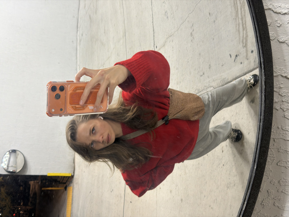 A mirror selfie captures a woman in a red sweater and grey sweatpants, accessorized with a tan patterned shoulder bag