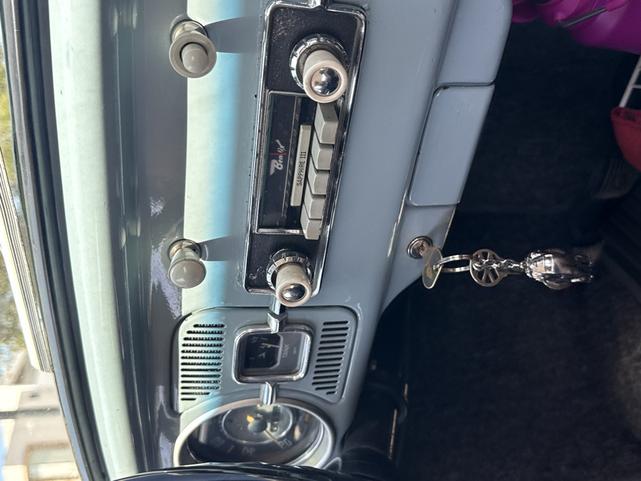This image depicts the interior of a vintage light blue vehicle, specifically the passenger side of the dashboard, located in the city of Santa Clara Ocoyucan, Mexico. The scene shows the dashboard from a slightly elevated perspective, looking forward. On the left, a portion of a black steering wheel is visible. To its right, a circular speedometer and a rectangular fuel gauge, labeled "TANK," are integrated into the dashboard. The fuel gauge needle indicates a level between 1/4 and 1/2. Below and to the left of the fuel gauge are vertical ventilation slots. Centrally located on the dashboard is a "Bendix Sapphire III" car radio, featuring two large chrome-accented knobs on either side and five light-colored push-buttons beneath its display. Two additional smaller, chrome-accented knobs are positioned above the radio, symmetrically placed on the dashboard. Below the dashboard, a key is inserted into the ignition cylinder. Attached to the key ring are a small, metallic key tag, a circular key ring with a stylized emblem, and a prominent, chrome-finished keychain charm resembling an animal, possibly a bulldog. The floor area in the lower right portion of the image shows dark carpeting. On the passenger side floor, a red object, possibly a cloth or bag, and a purple bottle are partially visible. Through the windshield, a blurred bright outdoor environment is apparent, suggesting daylight conditions and hinting at a building or structure. No individuals are visible in the frame.