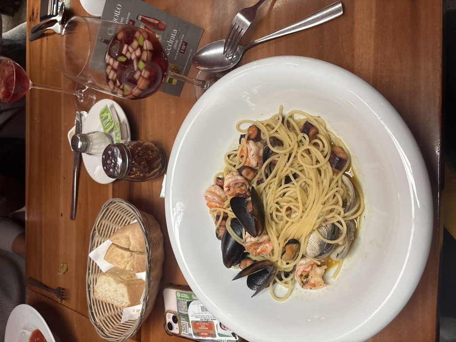The image depicts a dining table scene at the "Chillotto" restaurant in Puebla, Mexico. A large white bowl of spaghetti with seafood, including mussels, shrimp, clams, and octopus, sits centrally on a wooden table. To its left, a light-colored smartphone with a clear case and various cards tucked into it is present. To the right of the spaghetti bowl, a set of silver cutlery (a spoon and a fork) is placed on the table, alongside a stemmed glass containing red sangria with diced fruit. Further to the right, a dark menu card is partially visible, showing "Chillotto" and "Puebla." Behind the main dish, a small woven basket holds three slices of white bread. Adjacent to the bread, a salt shaker and two small green packets (likely condiments) rest on a white saucer, next to a glass shaker filled with red pepper flakes. In the upper background, a partially visible tall glass contains a red beverage. The upper left corner shows a segment of another white plate with red sauce. A person's arm, dressed in a grey garment, is visible in the background, indicating the presence of at least one diner.