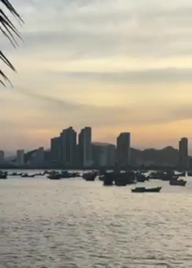 view of a city skyline across a body of water, likely an ocean or bay, during a sunset. The sky is filled with clouds and orange and yellow hues from the setting sun. Several tall buildings can be seen in the silhouette of the city skyline, interspersed with hills. Numerous small boats are scattered across the water, and the water appears relatively calm with small waves. A palm tree frond is visible in the foreground on the left side of the frame.