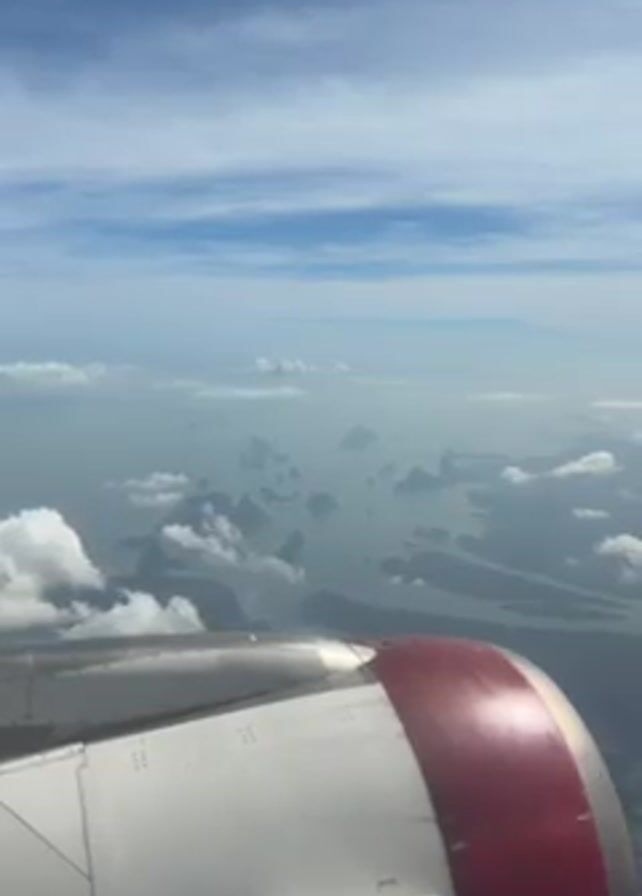 view from an airplane window. Part of the plane's engine is visible in the foreground. The sky is blue with scattered clouds. Below, there's a landscape featuring islands and water, partially obscured by haze and clouds.