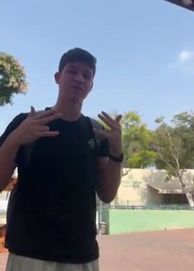 A young man stands outdoors in daylight. He is wearing a black t-shirt and light-colored striped shorts. He has a backpack. The man is making hand gestures. Behind him are trees, a building, and a blue sky. An architectural trellis is above him in the foreground. The ground is brick.