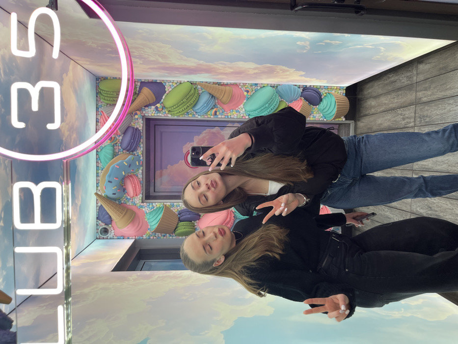 The image is a mirror selfie taken inside LUB 35, an establishment located in Sofia, Bulgaria. Two young adult females are posing for the photograph. The female on the left, with light brown hair styled in a ponytail, wears a black long-sleeved top and black wide-leg jeans. She makes a peace sign with her left hand and puckers her lips. The female on the right, with long, straight light brown hair, wears a black puffer jacket over a white top and blue jeans. She holds a dark-colored smartphone in her right hand to capture the image, while also displaying a peace sign with her left hand and puckering her lips. The interior environment features walls and a ceiling adorned with a sky and cloud motif. A prominent wall behind the subjects is decorated with numerous oversized, colorful 3D dessert models, including ice cream cones, macarons, cupcakes, and a donut, arranged around a purple door frame. Above, a white neon sign spells "LUB 35," with a partial pink neon ring visible to its right. The floor is composed of light grey patterned tiles.