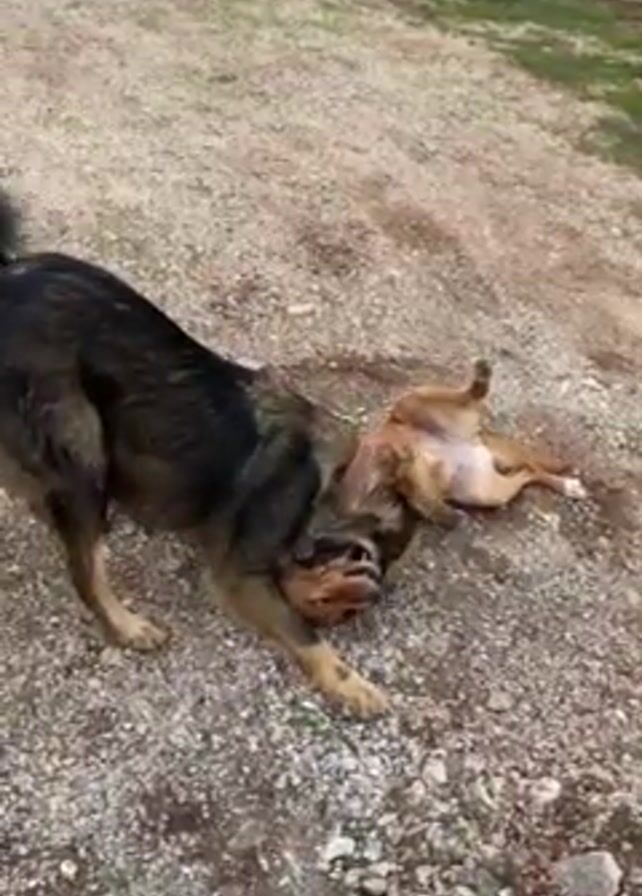 Two dogs are playing on a dirt and gravel ground. One dog is larger, with a dark brown and black coat, and the other is smaller, with a tan coat. The smaller dog is on its back, legs in the air, while the larger dog is standing over it, seemingly gently biting or mouthing the smaller dog's head. The scene takes place outdoors, with a patch of green grass visible in the background.