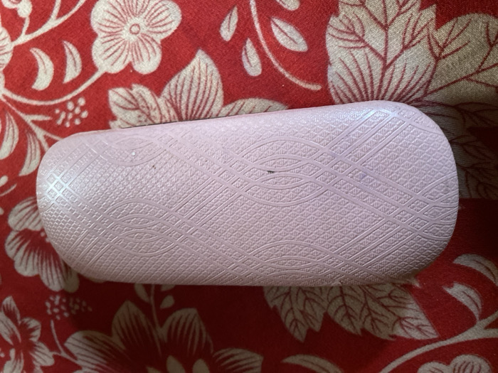 Location: City of Unknown, Unknown. A light pink, hard-shell eyeglasses case is positioned horizontally on a red fabric surface. The case is elongated and oval-shaped with rounded ends. Its exterior features an embossed, intricate geometric pattern of crisscrossing lines and interwoven scrollwork. A small dark speck is visible on the upper surface of the case towards the left. The fabric beneath the case is red with a repeating floral and botanical pattern in a lighter, off-white or cream color, depicting multi-petaled flowers and leaves. No individuals are present. No actions or specific interactions are depicted beyond the case resting on the fabric. The scene is evenly lit.