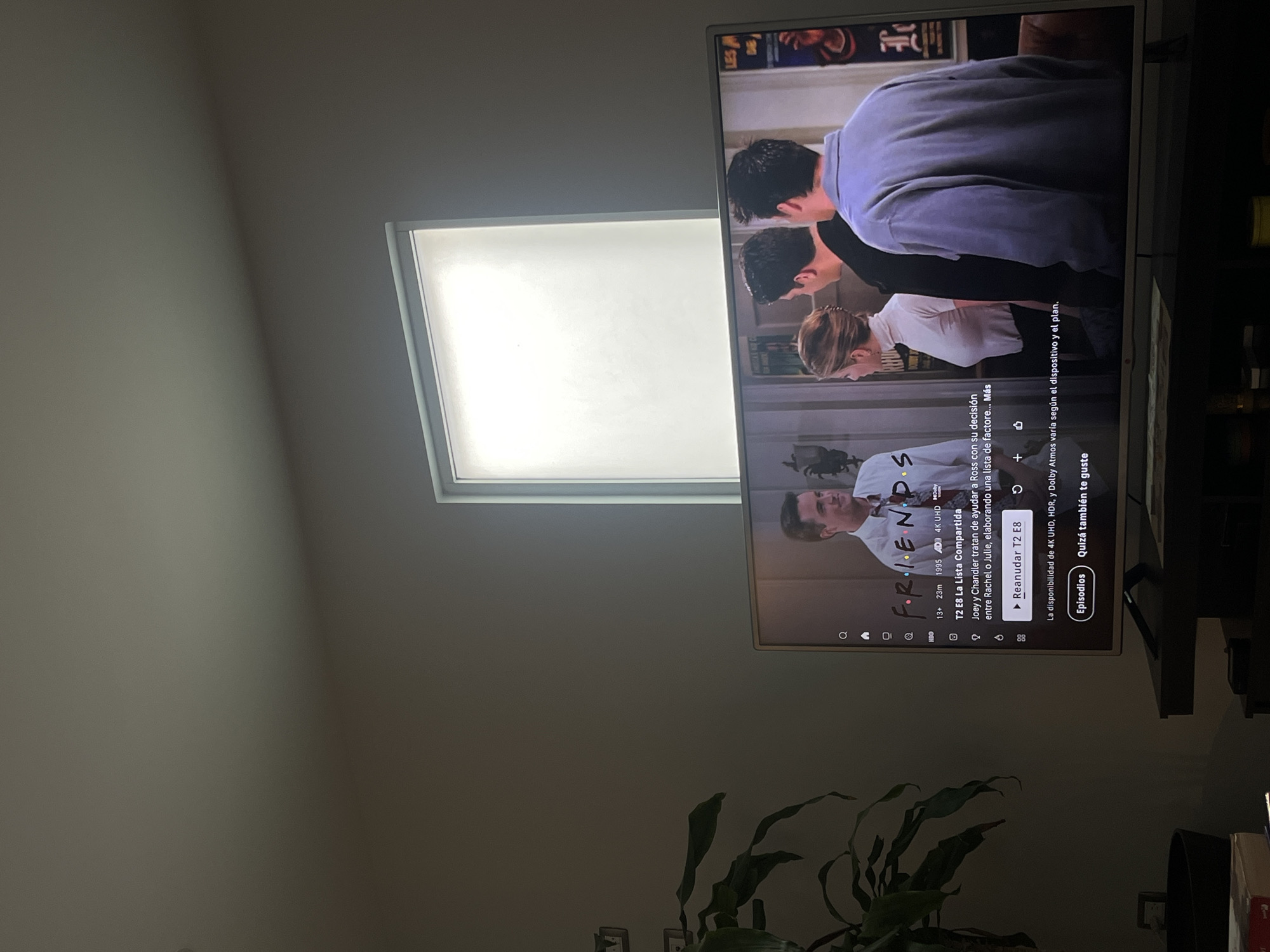 The image depicts an indoor scene in the Barrio de Nuevo León, Mexico, focusing on a television displaying content. The room is dimly lit with light-colored walls. A rectangular window, framed in white and covered by a translucent material, emits bright white light in the upper right quadrant. A large, dark green leafy houseplant in a dark pot is positioned in the lower-left, partially obscuring the view of a dark-colored entertainment console or TV stand. The central object is a flat-screen television. The screen displays a scene from the television show "Friends," with a menu overlay. Visible characters include Chandler Bing (wearing a light collared shirt and tie, looking forward), Rachel Green (wearing a light turtleneck, facing right), Joey Tribbiani (wearing a dark shirt, facing right), and Ross Geller (wearing a light blue long-sleeved shirt, back partially to the viewer, facing right). The menu indicates "FRIENDS," "T2 E8 La Lista Compartida" (The List Episode), an age rating "13+," duration "23M," year "1995 AD," and quality "4K UHD Dolby Atmos." A Spanish description reads: "Joey y Chandler tratan de ayudar a Ross con su decisión entre Rachel o Julie, elaborando una lista de factores..." (Joey and Chandler try to help Ross with his decision between Rachel or Julie, creating a list of factors...). A prompt to "Reanudar T2 E8" (Resume S2 E8) is visible. The TV is resting on a dark, flat surface, likely a media console. The overall scene suggests a casual domestic setting for media consumption.