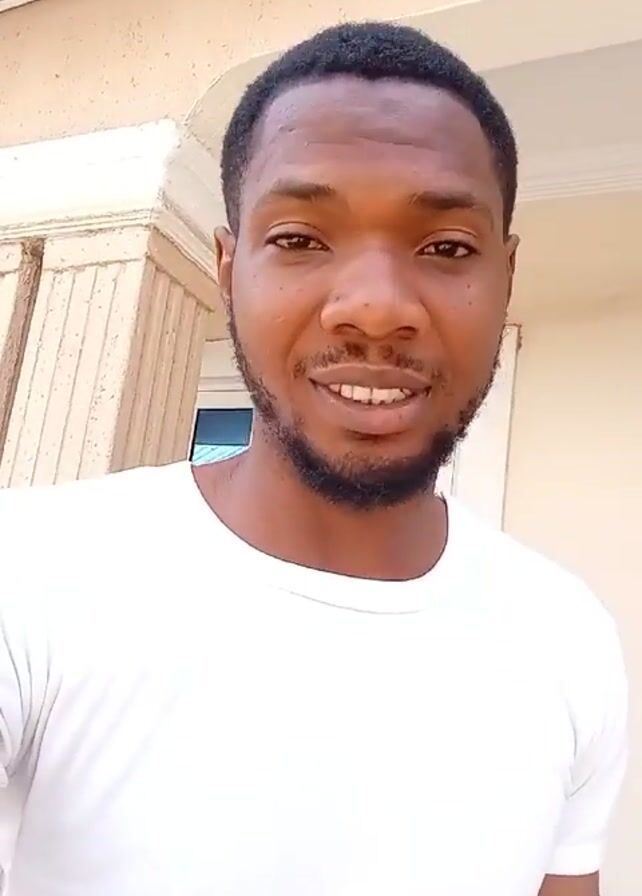 The video features a person in a white t-shirt, standing outside against the backdrop of a building. The person has short, dark hair and a trimmed beard. They are looking directly at the camera, with slight movements of their head. Behind them, there is a building facade with a white pillar and a window. The area appears to be well-lit by daylight. The person seems to be singing or humming a tune.