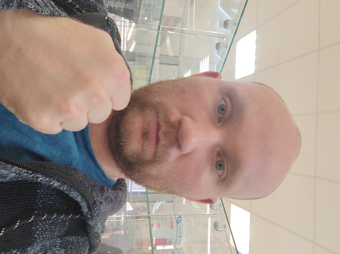 A bald man with blue eyes and a brown beard poses for a selfie. He wears a blue t-shirt and a gray sweater. His left hand is clenched into a fist near his face. The background shows a glass display case with items visible inside. The ceiling has fluorescent lights. The image is rotated ninety degrees clockwise.