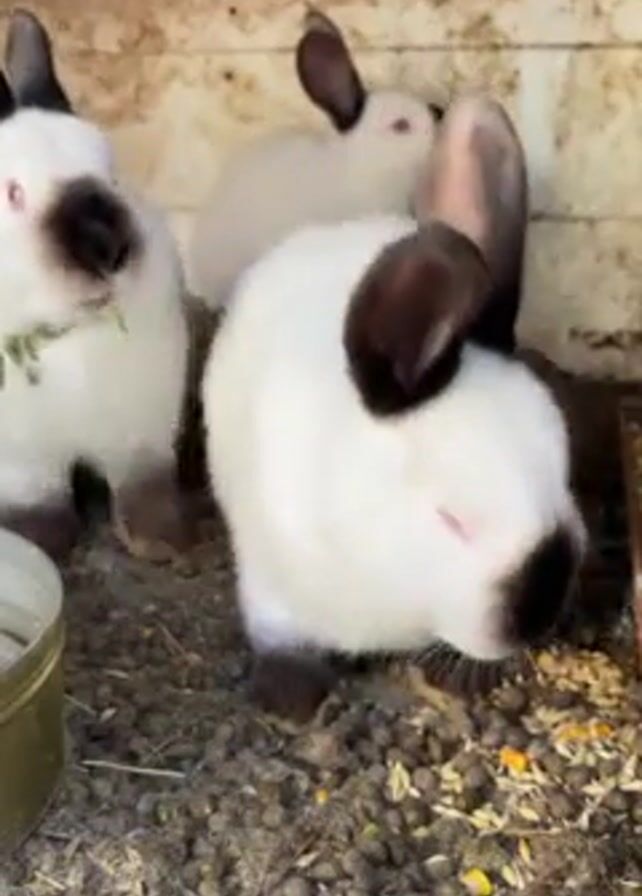three white rabbits with dark ears, noses, and paws in a wooden enclosure. They are standing on a floor covered in wood shavings and small brown pellets. One rabbit is eating a small piece of green vegetation. A small, round metal container is partially visible on the left side of the frame. A sound resembling a rabbit squeak or vocalization is audible.