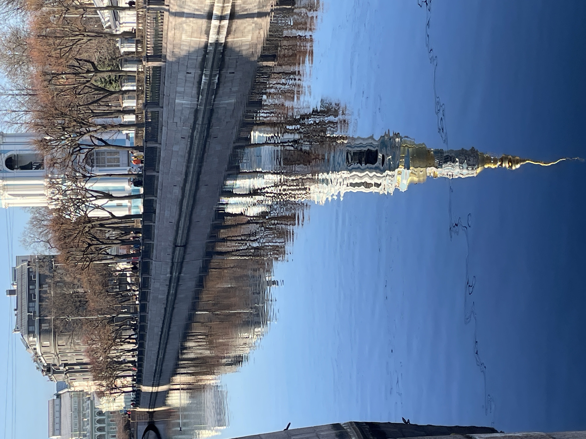 This image presents a forensically matter-of-fact view of the Kryukov Canal in Saint Petersburg, Russia. The scene is dominated by the calm, dark blue water of the canal, which perfectly reflects the architectural elements and bare trees along its banks. On the right side of the canal, the light blue and white bell tower of the Naval Cathedral of Saint Nicholas (Nikolsky Cathedral) rises prominently, topped by a golden spire that is clearly mirrored in the water below. A line of bare deciduous trees, stripped of leaves, suggesting a late autumn, winter, or early spring season, runs along the stone-faced embankment, interspersed with a dark metal railing. Several indistinct figures are visible walking on the pavement behind the trees, with one individual discernible in an orange jacket. On the left side of the canal, a multi-story, dark grey building with multiple windows and a complex roofline stands behind a similar line of bare trees and embankment. The sky above is clear and blue, indicating sunny weather. The water's surface exhibits subtle dark, wavy patterns in the foreground, likely surface tension effects or minor residue. A small, dark bird is visible floating on the water near the left bank. The overall impression is one of calm and crisp light, highlighting the classical architecture and waterways of the city.