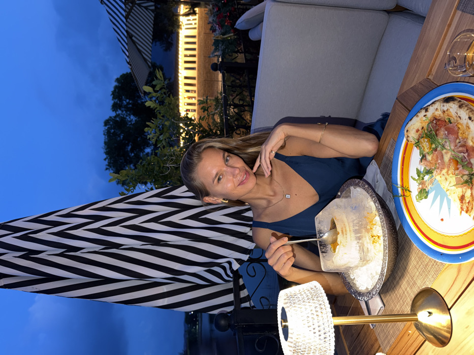 The image depicts an outdoor evening dining scene in Choeng Thale, Thailand. A fair-skinned female subject with long brown hair, wearing a dark teal camisole, is seated at a wooden table, smiling directly at the camera. Her right hand holds a spoon in a large clear ice block containing a yellow substance, possibly a dessert, served within a metallic bowl filled with crushed ice. Her left hand rests near her chin. On the table, to the right of the ice dish, is a partially eaten pizza topped with prosciutto, cherry tomatoes, and arugula on a multicolored plate with blue, orange, and yellow concentric rings. A clear glass containing an amber liquid is next to the pizza. A small, decorative table lamp with a gold base and a textured clear shade illuminates the immediate foreground. In the background, a large black and white striped patio umbrella is visible to the left. Beyond the seating area, a body of water is discernible, with a building featuring warm yellow strip lighting across its facade in the distance. The sky is dark blue, indicating dusk or night. Green foliage and additional outdoor furniture are also present. The seating visible consists of light-colored, upholstered outdoor cushions.
