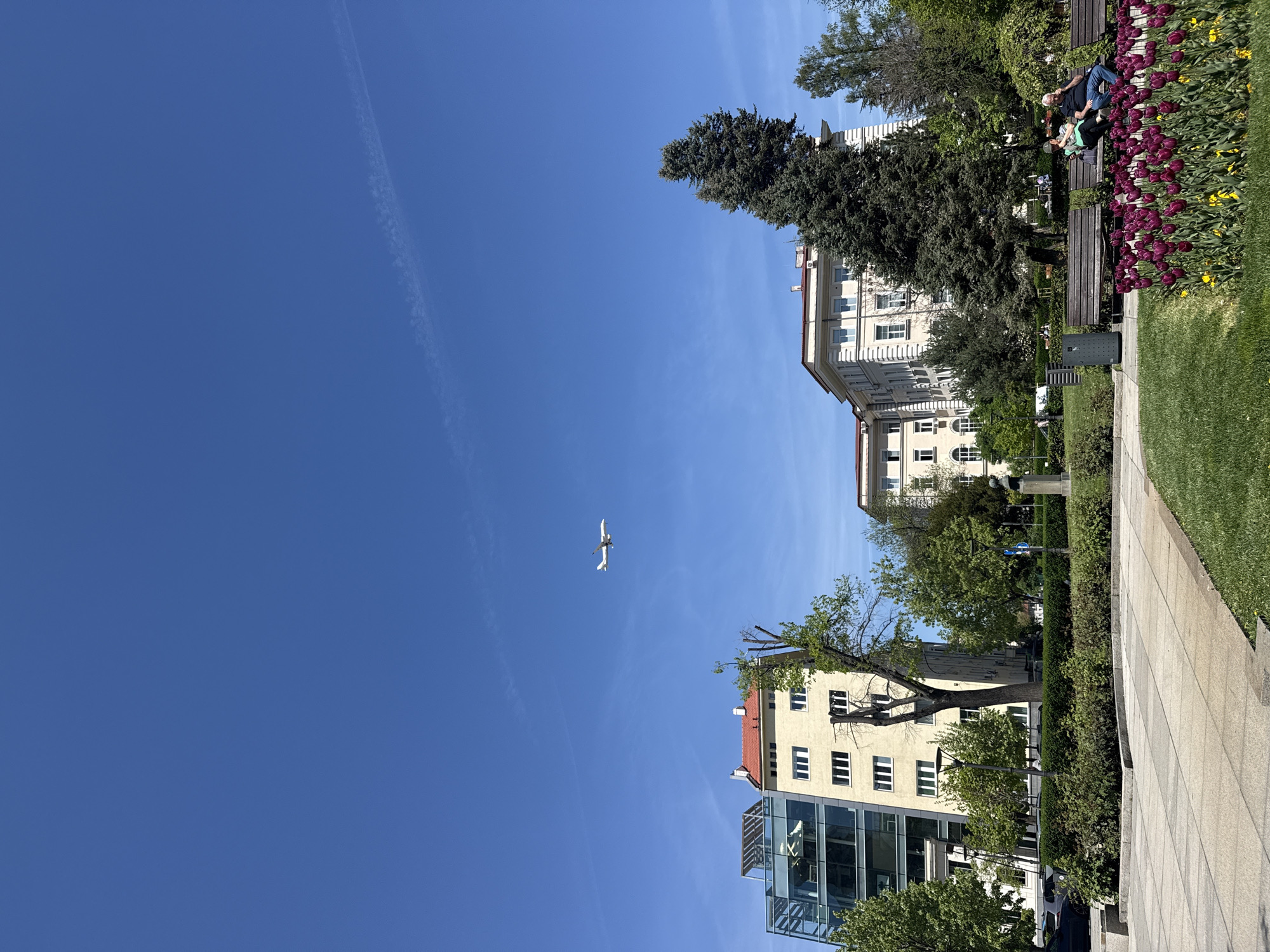 The image depicts an urban scene in Sofia, Bulgaria. A clear blue sky dominates the upper left of the frame with a contrail visible. A white airplane is present in the sky. Buildings line the right side of the frame. On the upper right, a light-colored building is partially obscured by a large green tree. Adjacent to the tree, a park area includes benches with people sitting on them among tulips and other flowers. In the lower right, a sidewalk leads into the scene. A modern glass-fronted building is partially visible beneath a light-colored building with a red roof. Green trees and shrubs are scattered throughout.