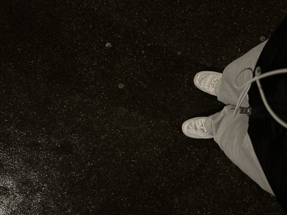 A first-person perspective shows a person standing on a dark, possibly wet, surface. The person wears white sneakers and light grey, wide-leg pants. Part of a black jacket or shirt is visible on the right. The surface appears to be asphalt or concrete with small speckles. There are a few small, round objects scattered on the ground, possibly coins or small stones. The overall lighting is dim, giving the scene a moody or nighttime feel.