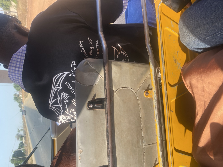 The image captures a view from inside a moving vehicle on a road in Katcha, Nigeria. In the foreground, the lower body of a person is visible, with one leg covered by orange fabric and the other by blue jeans, resting on a yellow metal floor. Immediately in front, the back of another person is visible, wearing a black t-shirt featuring a white graphic of a winged creature and partial text "ED SS CTIONS + MGP" and "SUNDAY Aug. 25 3:00 P.M." A blue and white checkered shirt collar is visible beneath the t-shirt. A worn, light grey upholstered seat back with metal fixtures is positioned between the foreground and the person in front. Beyond the vehicle's interior, a paved road extends into the distance under bright daylight, bordered by sparse vegetation and distant structures. A vehicle is discernible in the far distance on the road.