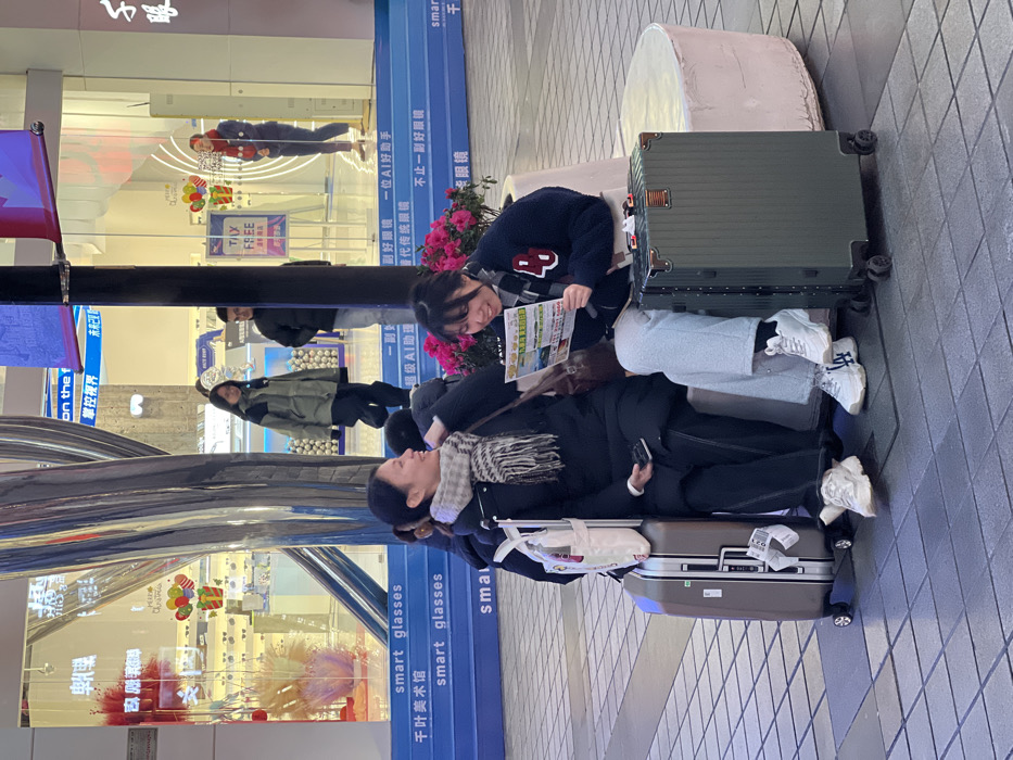 This image depicts an urban street scene in a commercial area of Yuzhong District, China. In the foreground, two East Asian females are seated on a light-colored, circular concrete bench. The female on the left wears a dark winter jacket, a light-colored checkered scarf, dark trousers, and white chunky sneakers. A light brown rolling suitcase with a white tote bag attached is positioned to her left. She holds a dark-colored smartphone and is observed smiling towards the female on her right. The female on the right is dressed in a dark blue fuzzy jacket featuring a white '4' emblem, light grey sweatpants, and white chunky sneakers, one with an 'LA' logo. She holds an open, multi-page brochure or map, looking at it and laughing. A dark green rolling suitcase is situated to her right. Directly behind the seated individuals is a blue tiered display featuring "smart glasses" in English and Chinese script. Red flowers are visible in a planter behind the bench. To the left, a large, reflective silver twisted sculpture stands vertically. In the background, visible through the glass storefront, individuals are present: a female in a green jacket walks from left to right, and a male in a dark jacket is partially obscured by a dark pole. Further right, a female wearing a red scarf stands inside the store, which displays 'Tax Free' and Christmas decorations, including 'Merry Christmas' text. The ground surface is composed of square tiles.