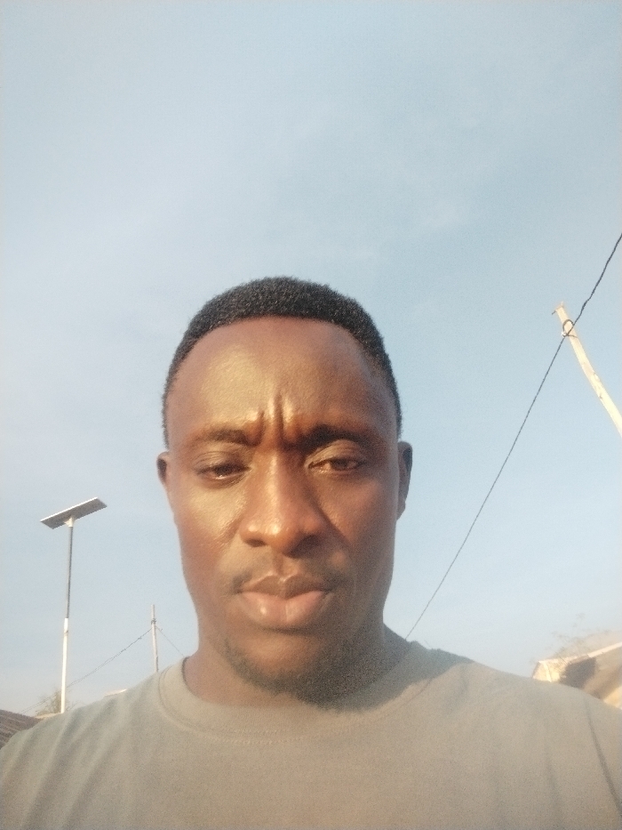 The image displays a head-and-shoulders portrait of an adult male, likely of African descent, looking directly at the viewer with a neutral to slightly stern expression. His brows are furrowed, and his lips are closed. He has short, dark, closely-cropped hair and is wearing a plain grey t-shirt. The lighting suggests strong, direct sunlight, creating highlights on his forehead and nose, and subtle shadows under his brow. The background consists primarily of a clear, pale blue sky with minimal cloud cover, indicating an outdoor daytime setting. To the left, a tall, slender pole with a rectangular solar panel mounted at its apex is visible, suggesting a solar-powered light fixture. To the right, a wooden utility pole with a single dark wire extending horizontally is partially obscured. Faint, blurred outlines of structures, possibly buildings or vegetation, are discernible on the distant horizon, particularly behind the utility pole. The overall environment is consistent with an urban or semi-urban area within Lokoja, Nigeria; however, a specific street or landmark within the city is not identifiable from the visual evidence. No actions or interactions are depicted beyond the subject posing for the photograph.