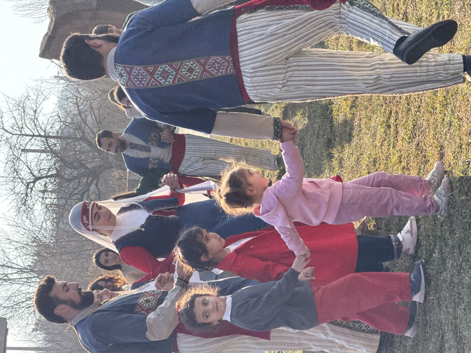 In Dsegh, Armenia, an outdoor scene depicts approximately eight individuals participating in a communal activity on a grassy field under bright daylight. The group, comprising adults and three young children, forms a continuous line, holding hands. On the left, a bearded adult male wears a blue tunic with patterned trim on the sleeves, light-colored striped pants, and a red sash; he holds hands with a woman to his right. This woman is dressed in traditional Armenian attire, featuring a red long-sleeved top, a dark blue embroidered vest, a white head covering with a pearl-adorned veil extending over her shoulders, and a dark skirt. She holds hands with the man on her left and another adult male positioned behind her. In the foreground, from left to right, three young girls hold hands. The leftmost girl wears a dark grey long-sleeved top and red pants. The central girl wears a red coat over a dark garment. The rightmost and smallest girl wears a pink hooded sweatshirt and pink pants. On the far right, an adult male with his back partially to the viewer wears a dark blue tunic featuring a prominent vertical geometric patterned panel on the back, light-colored striped pants, and a red sash. He holds the hand of the youngest girl. Other adult figures are visible in the background, also holding hands or standing nearby. The ground consists of green grass. Bare deciduous trees are visible in the distant background, and a stone structure is partially discernible on the far right. The scene is illuminated by strong sunlight, casting visible highlights.