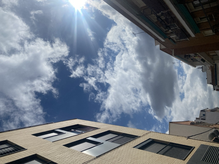 The image captures an upward view of a street in the city of Unknown, Unknown, under a bright blue sky partially obscured by white and gray cumulus clouds. The sun is prominently visible in the upper right quadrant, emitting strong rays and a lens flare effect. On the left side of the frame, a multi-story building constructed with light yellow brick extends from the bottom to the top. It features multiple rectangular windows with dark frames and integrated exterior roller shutters, some of which are partially or fully closed. A section of dark gray paneling is visible on the lower part of the building, above a small, circular light fixture. Some windows reveal interior spaces or small balconies with black metal railings. On the right side, another multi-story building with reddish-brown brickwork is visible, featuring multiple balconies with dark metal railings. Light green or teal awnings are extended above several of these balconies, and items resembling laundry or other objects are discernible hanging on some. A television antenna is mounted on the roofline of this building. Further down the street, additional residential structures of varying heights and colors are visible in the background. No people or active interactions are visible within the scene.
