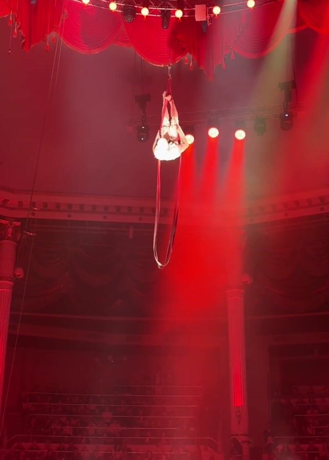 An aerialist in a white outfit performs suspended from a hoop and ribbons in a circus environment. The performer is illuminated by red spotlights, set against a backdrop of red curtains and the red-toned audience area. The venue appears to be a classic theater or circus building with ornate architectural details. The acrobat transitions to a T-pose while hanging upside down from the apparatus.