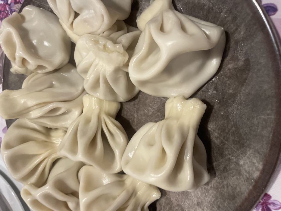 - "The scene displays approximately eleven pale, off-white Khinkali dumplings arranged on a dark grey, mottled ceramic plate" by FM-oln9s2, licensed under CC BY 4.0